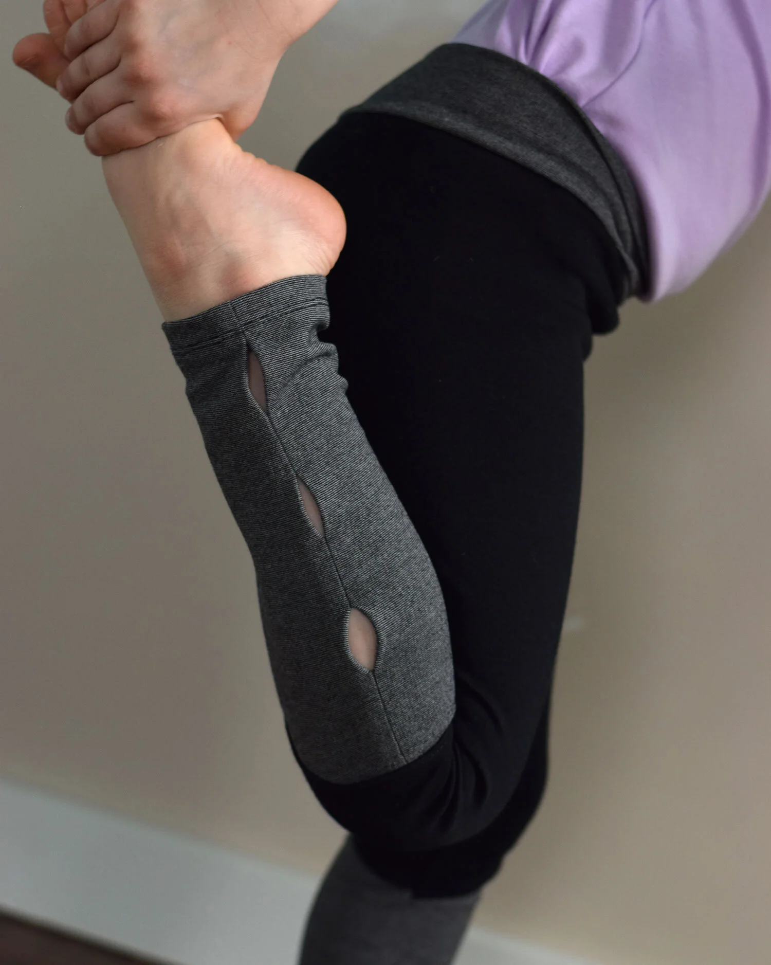 I whipped up matching outfits using the Aurora Raglan and Rocky Shore Tights patterns. I even pulled off the little peek-a-boos in the lower leg panels. I really deserve bonus points for that. I tried to have them do some yoga poses, but that was hilarioulsy terrible!
